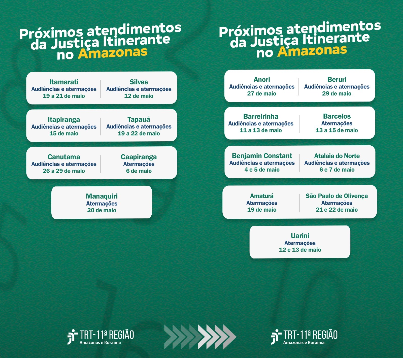 O Tribunal Regional do Trabalho da 11ª Região (AM/RR) realizará atendimentos em 16 municípios do interior do Amazonas no decorrer do mês de maio. A iniciativa, organizada pela Corregedoria Regional do TRT-11, integra a política de interiorização dos serviços da Justiça do Trabalho, com o objetivo de garantir que direitos trabalhistas cheguem em localidades distantes das sedes das Varas.