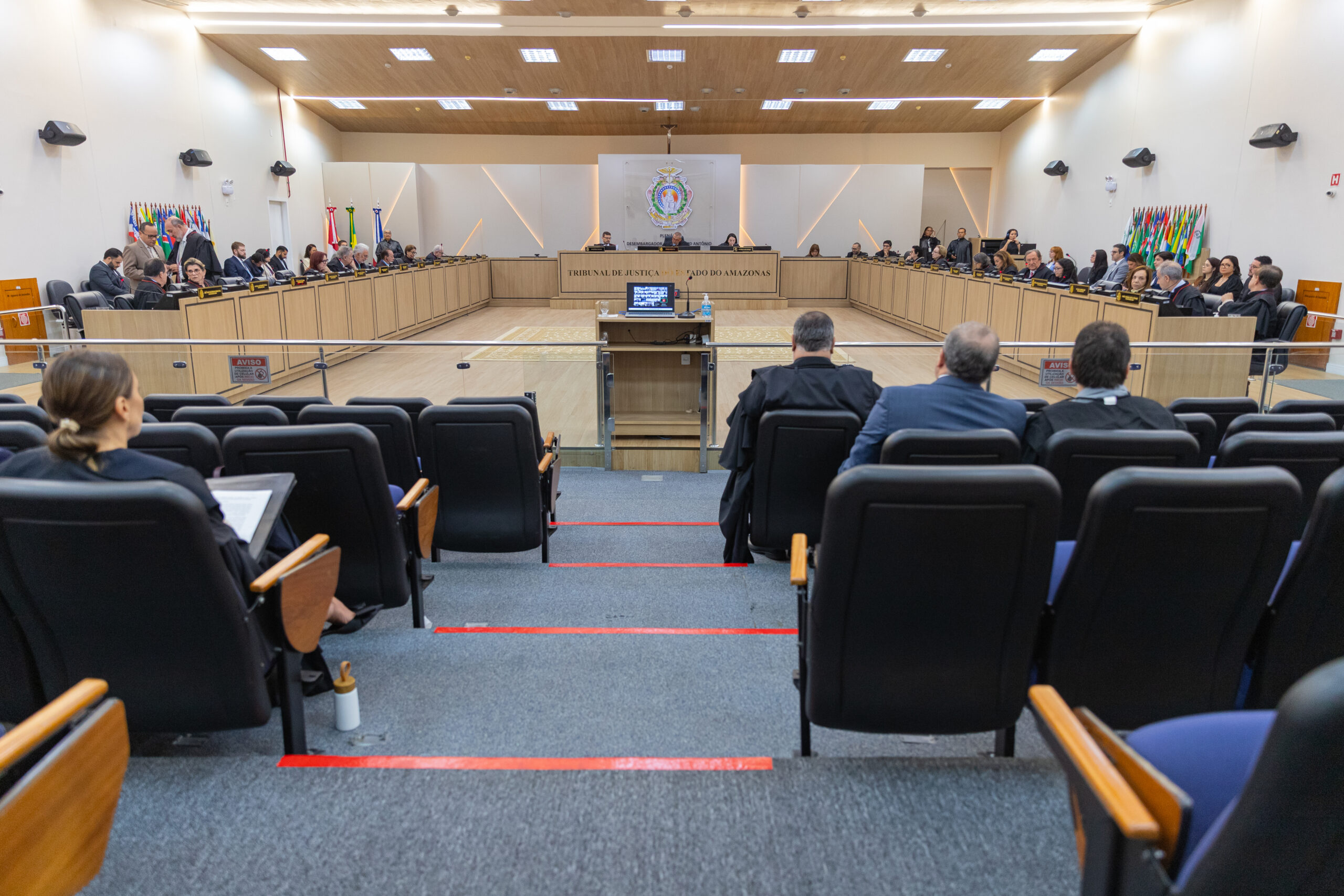 #PraTodosVerem: A fotografia que ilustra o texto mostra o plenário do Tribunal de Justiça do Amazonas durante uma sessão. Diversas pessoas estão sentadas em bancadas dispostas em formato semicircular, usando trajes formais. Ao centro, há uma mesa principal com o nome do tribunal na parte frontal e o brasão na parede ao fundo. Bandeiras estão posicionadas nas laterais. Em primeiro plano, aparecem cadeiras do auditório vistas de trás, com algumas pessoas sentadas acompanhando a sessão. Fim da descrição.